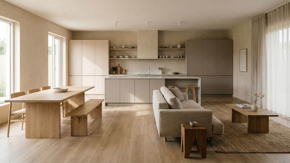 Een Japandi vloer moet rust, warmte en natuurlijkheid combineren. Lichte houttinten en warme beige nuances werken het beste. Een matte afwerking is essentieel, omdat glans de balans verstoort. In moderne woningen is PVC vaak de meest praktische keuze. Door één consistente vloer door te trekken in meerdere ruimtes versterk je het serene Japandi-effect.