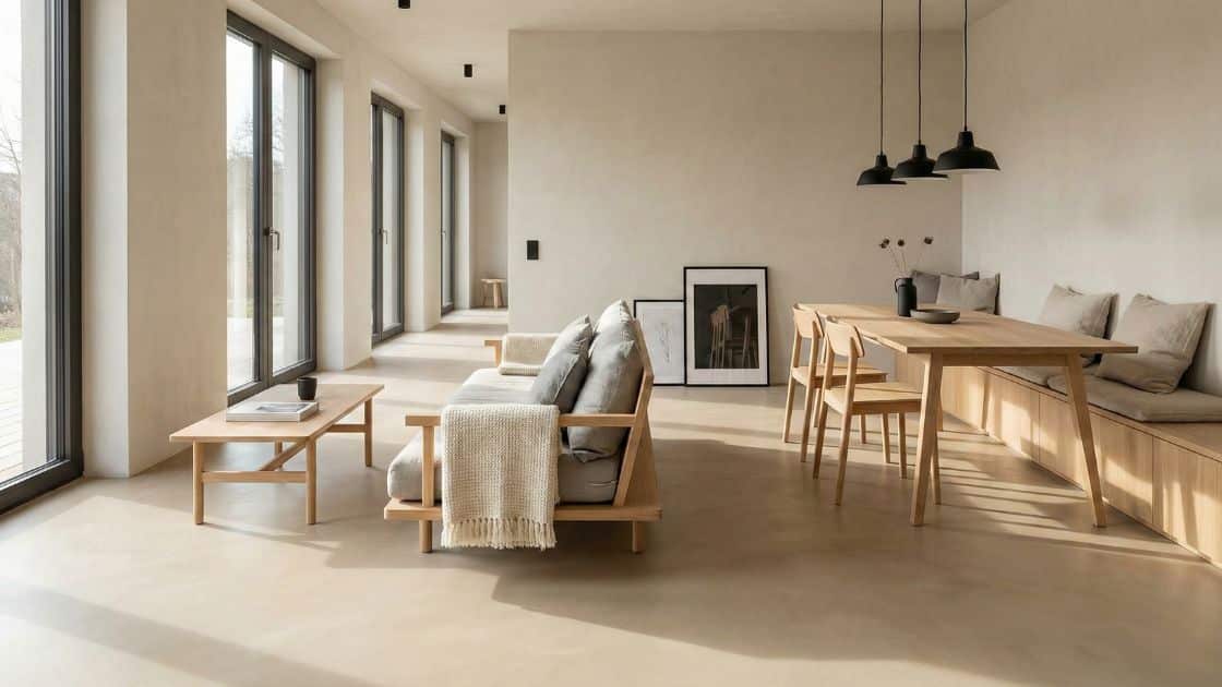Wie een strakkere interpretatie van Japandi zoekt, kan kiezen voor een lichte betonlook vloer. Dit werkt vooral goed in open ruimtes met veel daglicht. Kies altijd voor een warme greige of beige betonlook, zodat het interieur niet koel aanvoelt.