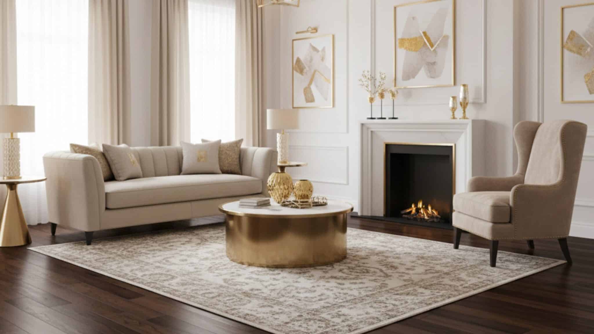Afbeeldingsprompt: Luxe woonkamer met donker noten PVC vloer, lichte muren en gouden accenten.